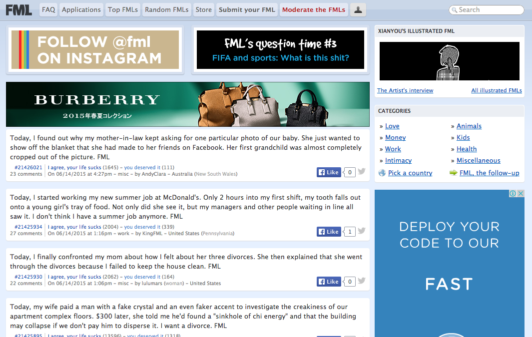 FMLというサイトを御存知でしょうか。”FML”は”Fuck My Life”の略で、要は自分に起こった最低な体験を投稿することが出来るサイトです。